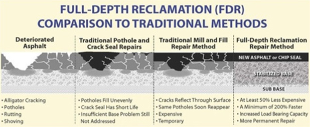 Full-depth reclamation uses the materials from the existing deteriorated asphalt pavement and, with the addition of cement or lime, creates a new stabilized base.